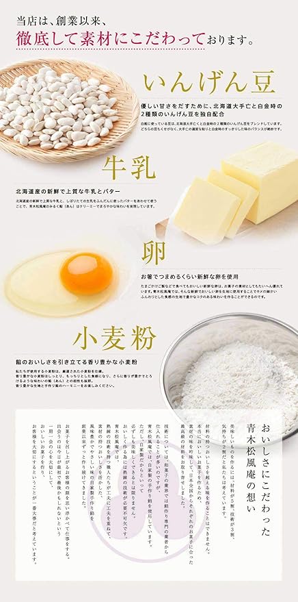 Milk Manju Tsukikesho has been awarded the Grand Gold Award and Gold Awards at the Monde Selection multiple times. The white bean paste is a blend of Hokkaido-grown Otebo and Shirokintoki rice, cooked with plenty of high-quality butter and condensed milk for a rich milk flavor. [Net Quantity] 6 [Shelf Life] 80 days [Ingredients] Kidney beans, sugar, condensed milk, wheat flour, butter, eggs, starch syrup, reduced starch syrup, honey, milk powder, rice syrup, trehalose, leavening agent [Allergens] Egg, wheat, milk. A wonderful gift. Each box includes one carrying bag.