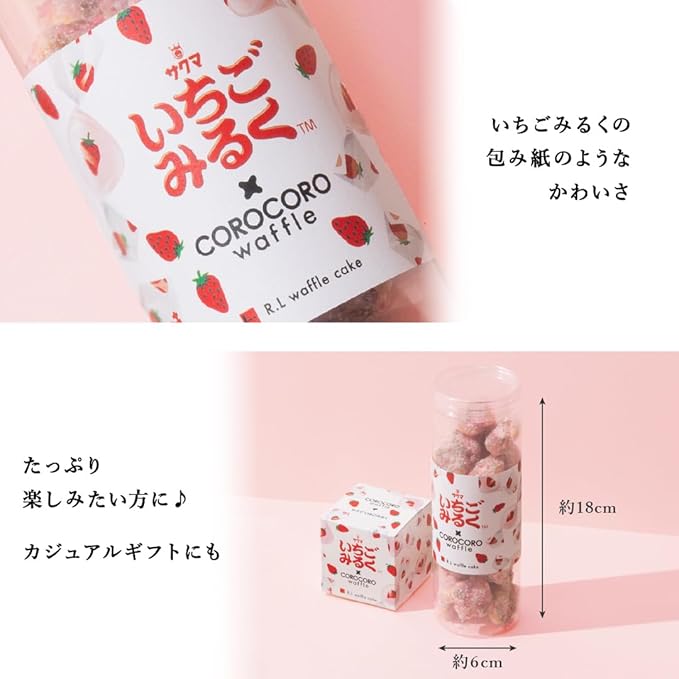 This is the first collaboration between R.L Waffle Cake’s crispy “Korokoro Waffles” baked in a waffle maker and Sakuma Confectionery’s “Strawberry Milk”! These incredibly cute and slightly special “Korokoro Waffles” are filled with that sweet and sour taste. [Contents] Each 180g “Strawberry Milk” tube (tube size: approximately 180mm high x 60mm diameter), about the size of a 500ml plastic bottle. [Storage and Expiration Date] ◆Storage Instructions: Store at room temperature. *Avoid high temperatures and humidity, and store in a cool, dark place. ◆Best-by Date: 90 days after the date of manufacture. *At least 30 days after the shipping date. [Gift-Friendly] No price tag will be included. A red carrier bag will be included with your order. If you select “Gift Settings,” the order will be labeled as the gift recipient on the shipping slip. (Please note that the system will display the address as our factory.) [Featured on TV] R.L products were featured on Nippon Television’s “Hirunandesu!” on October 19, 2023, Nippon Television’s “DayDay.” on August 8, 2023, and Fuji Television’s “Nonstop! NONSTOP!” on July 19, 2023. They were also featured as souvenirs on Fuji Television’s “Even if You Don’t Do It for Me” on May 25, 2023. [Usage] [Gift] Present, souvenir, small gift, greeting, birthday, housewarming, sweet box, gift, New Year’s gift, Lunar New Year, Setsubun, Valentine’s Day, White Day, Hinamatsuri (Girl’s Day), birth, marriage, entrance to school, graduation, entering kindergarten, graduation from kindergarten, joining a company, retiring, transfer, new life, new fiscal year, Mother’s Day, Children’s Day, Father’s Day, Tanabata, mid-year gift, summer gift, summer greeting, summer greeting, late-summer greeting, Obon, returning home, Respect for the Aged Day, Halloween, year-end gift, Christmas, winter greeting. [Usage] [Everyday Use] Sweets, snacks, reward, tea, tea time, souvenir, party, event, present, gift, mail order.