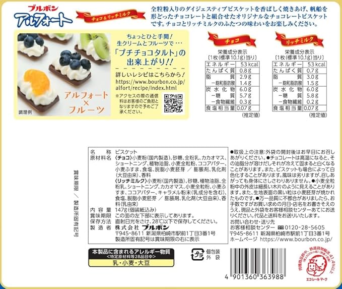 Wheat flour (domestically produced), sugar, whole milk powder, cocoa mass, shortening, vegetable oil, whole wheat flour, cocoa butter, wheat bran, salt, defatted wheat germ/leavening agent, emulsifier (soy-derived), flavoring. Wheat flour (domestically produced), sugar, vegetable oil, whole milk powder, shortening, cocoa mass, whole wheat flour, wheat bran, cocoa butter, caramel powder (contains dairy ingredients), salt, defatted wheat germ/leavening agent, emulsifier (soy-derived), flavoring (dairy-derived).
