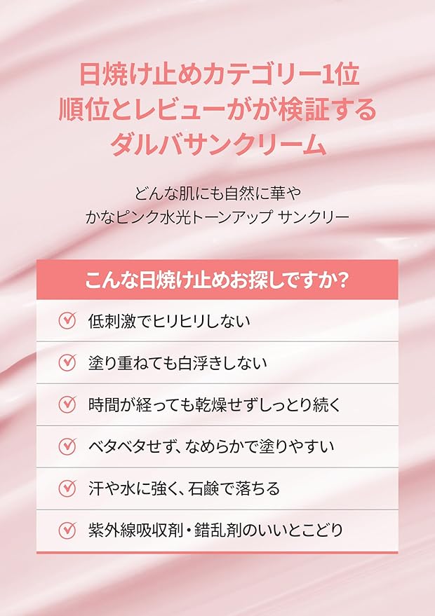 đ¸ [For Pink Tone Up (Fruit, Brightness)] This moisturizing pink radiance sun cream has a watery pink texture that glides on smoothly. It creates a natural, moisturized pink tone that matches your skin tone. đ¸ [Skin Tone Correction and Radiance Simultaneously] The natural tone-up effect leaves your skin looking brighter and healthier, like bare skin. This natural-looking sun cream can also be used as a makeup base. đ¸ [Strong UV Protection] The dual-blocking formula of SPF50+/PA++++ provides strong protection against UVA and UVB rays. Safe for everyday use and outdoor activities. đ¸ [Hypoallergenic and Gentle on Sensitive Skin] Vegan formula and skin irritation tested. Designed for a gentle application, it’s suitable for dry and sensitive skin. đ¸ [Easy Washable, One-Time Cleansing] While maintaining a firm seal, it eliminates the need for repeated washing. Easy to wash, it removes makeup with a single cleanse. đ¸ [Sweat and Water Resistant] Sweatproof tested, this formula is sweat and water resistant and prevents makeup from smudging. Feel free to use it in the summer or outdoors.