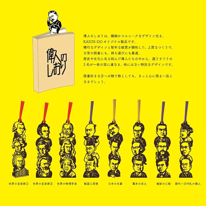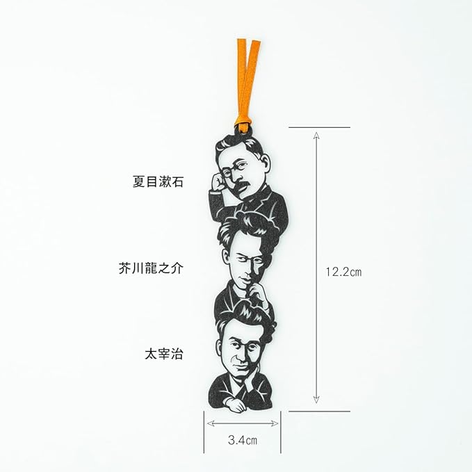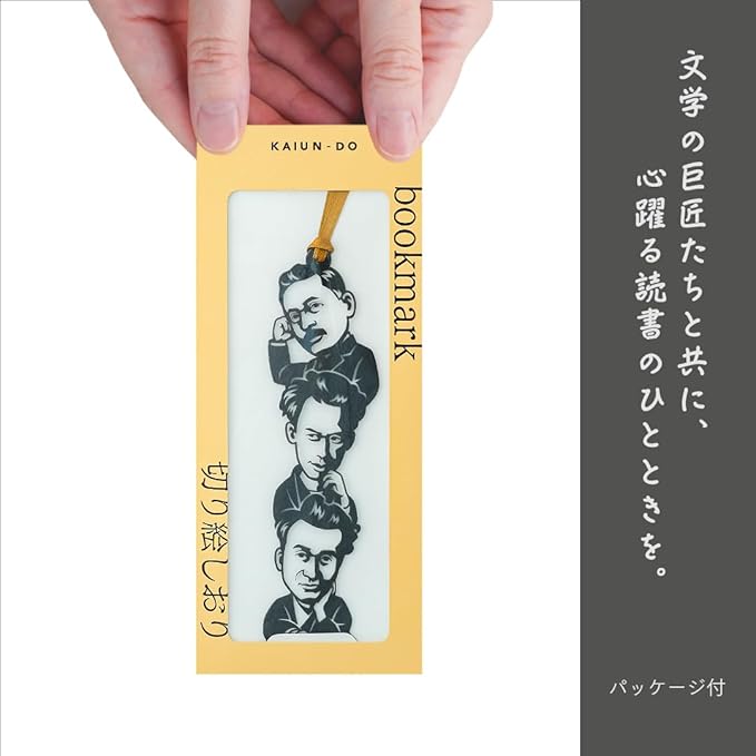 * This is an original KAIUN-DO bookmark with a design that brings together three of Japan’s greatest literary figures: Natsume Soseki, Akutagawa Ryunosuke, and Dazai Osamu. * The bookmark string is purple. * Product size: 12cm high x 3.4cm wide x 1mm thick (excluding the bookmark string). * Made from durable, tear-resistant cardboard, so it can be used for a long time. * The eye-catching packaging makes it a must-have. Also makes a great gift.