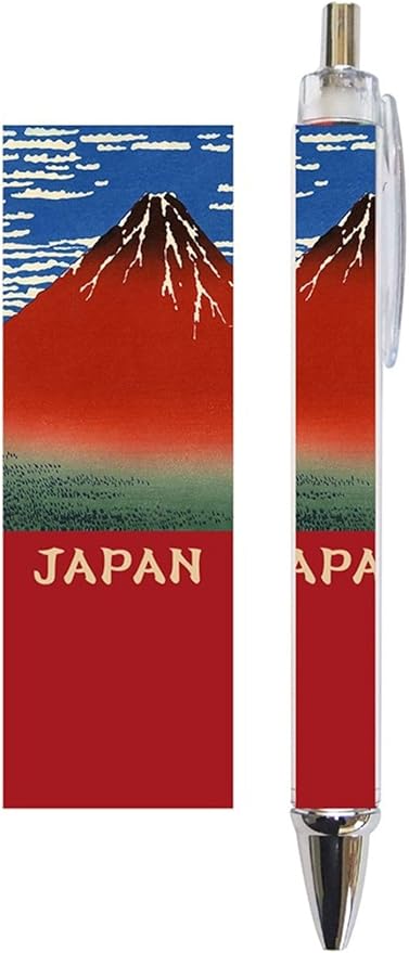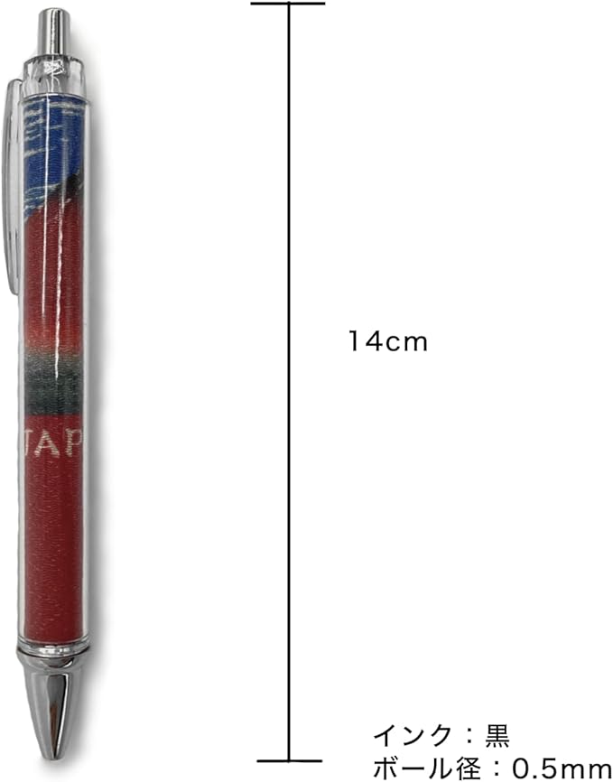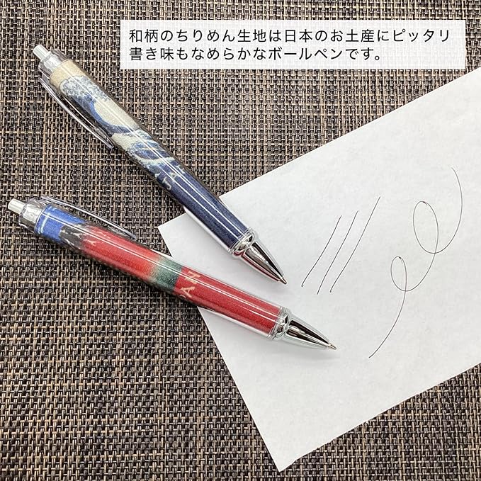 [Country of Origin] Body processing: China, Printing: Japan [Materials] Body: Resin, Stainless Steel; Fabric: Polyester Chirimen; Ink: Oil-based, Black [Size] Body: Approx. 14cm, Ball Diameter: Approx. 0.5mm This ballpoint pen has a polyester chirimen fabric wrapped around the body. It is covered with a clear tube to prevent stains on the fabric. The body is slightly thicker for a comfortable grip, and the nib is approximately 0.5mm, providing a soft feel and easy writing. This is an easy-to-use knock-type ballpoint pen. The ink is disposable. The design is based on Katsushika Hokusai’s famous “Fine Wind, Clear Morning.” Perfect for everyday use, slightly more formal occasions, or at the front desk of a shop, inn, or hotel. It also makes a great souvenir or gift for homestays, overseas business trips, overseas travel, or returning home from overseas.