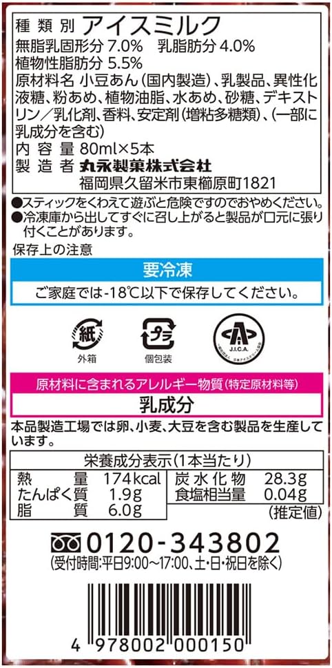 A long-selling Japanese-style ice cream, now in its 60th year of sales. This melt-in-your-mouth Japanese-style ice cream features azuki bean paste that remains soft even when frozen. Made with Hokkaido azuki beans. This Kyushu specialty ice cream is shaped like a plum, the prefectural flower of Fukuoka Prefecture, where Marunaga Confectionery is headquartered. Ingredients: Azuki bean paste (made in Japan), dairy products, isomerized liquid sugar, powdered sugar, vegetable oil, corn syrup, sugar, dextrin/emulsifier, flavoring, stabilizer (thickening polysaccharide), (contains milk ingredients). Nutritional Information: Per product: Energy: 174kcal, Protein: 1.9g, Fat: 6g, Carbohydrates: 28.3g, Sodium equivalent: 0.04g. Allergens: Milk. Brand: Marunaga Confectionery.