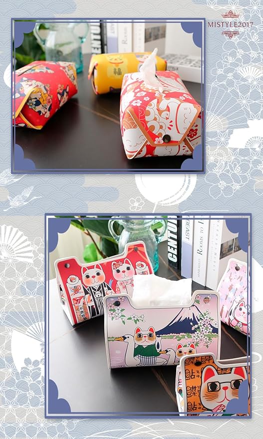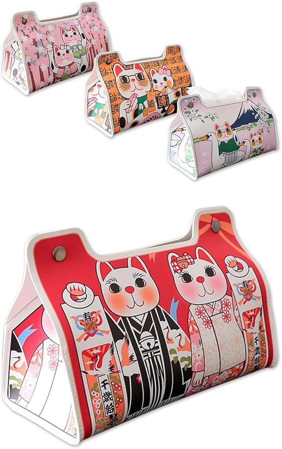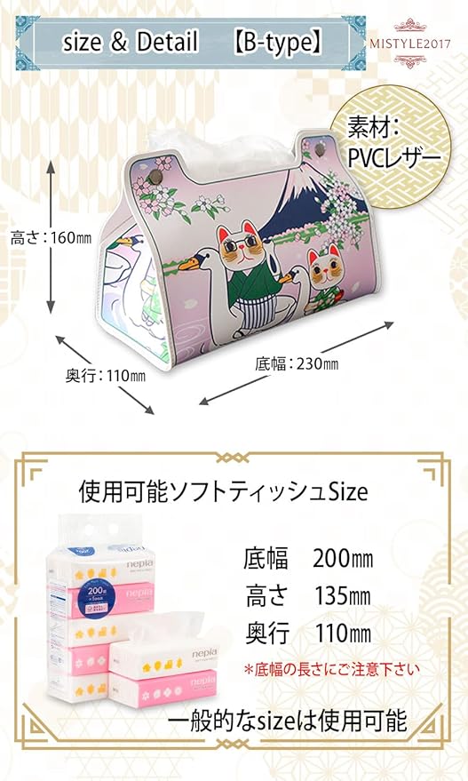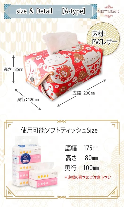 😽 Type B [Product Details] Material: PVC Leather / Size: Base Width: 20cm x Depth: 11cm x Height: 13.5cm / Color: 4 colors / Note: Soft pack tissues recommended 😽 [Made of High-Quality PVC Leather] Made of PVC leather that resembles genuine leather. It is water-resistant and stain-resistant, impervious to oil and water, and can be wiped clean with a damp cloth, ensuring timeless beauty and functionality. 😽 [A Convenient Souvenir for Foreigners] Our tissue case is practical and can also be used as interior décor, making it a sure-to-please souvenir or gift for foreigners. 😽 [Product Contents] Tissue Cover = 1 (Tissue paper not included). 😽 [Safety and Security] Carefully inspected by our quality control staff. 30-day money-back guarantee. If there is any initial defect, please contact us without hesitation. We will promptly replace it with a new one. *Please contact Amazon Customer Service via your order history. *Registered trademark product