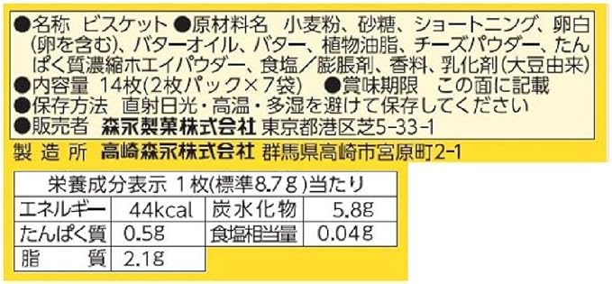 Ingredients: Wheat flour, sugar, shortening, egg white, butter oil, butter, vegetable oil, cheese powder, protein-enriched whey powder, salt, leavening agent, flavoring, emulsifier (soy-derived). Product dimensions (H x D x W): 58mm x 95mm x 158mm. Enjoy the fluffy, fragrant taste of butter. Brand: Morinaga & Co., Ltd. Manufacturer: Morinaga & Co., Ltd.