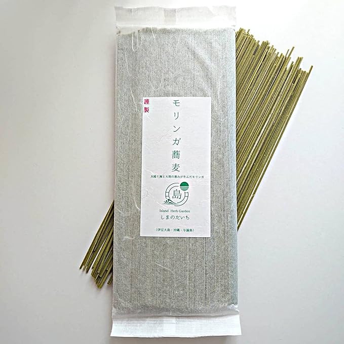 Shimanodai Moringa Soba is made with domestically grown, pesticide-free moringa powder grown in-house. This dried noodle (best-by date: 12 months from date of manufacture) is a healthy soba noodle made with the nutritious superfood moringa. Kanemiya, a maker of moringa soba noodles from northern Echigo, was founded in 1925 and produces its own naturally aged, naturally dried noodles. Carefully selected buckwheat ingredients are carefully kneaded with saltwater made from local groundwater and the underground waters of Mt. Omine, then naturally dried using traditional methods. These smooth, chewy noodles retain their firmness even after boiling, and are rich in the aroma of moringa. Enjoy them hot or cold. Made with moringa powder grown in-house in Japan without pesticides. Chlorella, another nutritious superfood, is also included. Soba noodles are rich in nutrients, including rutin, protein, carbohydrates, choline, dietary fiber, and B vitamins. The nutritious superfood moringa is made from powdered moringa grown in Japan without pesticides on our own farm. The noodles also contain chlorella, which further enhances their nutritional value.