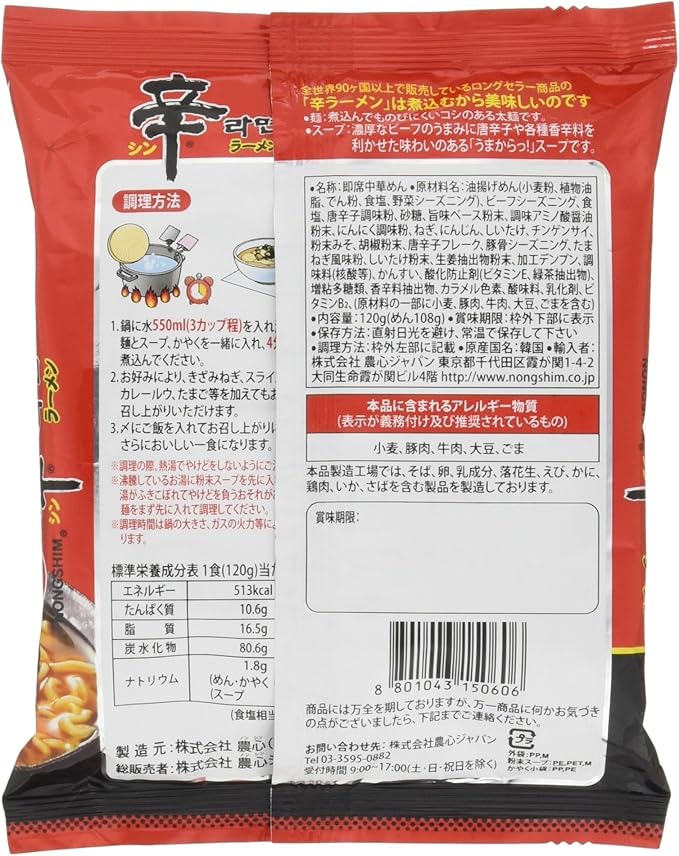Ingredients: Fried noodles (wheat flour, vegetable oil, starch, salt, vegetable seasoning), beef seasoning, salt, chili pepper seasoning powder, sugar, umami base powder, seasoned amino acid soy sauce powder, green onion, garlic seasoning powder, carrot, shiitake mushroom, powdered miso, pepper powder, chili pepper flakes, pork bone seasoning, onion flavor powder, shiitake mushroom powder, ginger extract powder, modified starch, seasoning (nucleic acid, etc.), kansui (alkaline water), antioxidants (vitamin E, green tea extract), thickening polysaccharides, spice extract, caramel color, acidulant, emulsifier, vitamin B2 (contains wheat, pork, beef, soybeans, and sesame). Brand: Spicy. Product size (H x D x W): 35mm x 140mm x 180mm. Shin Ramyun combines the deliciousness of beef soup and the spiciness of chili peppers with thick noodles to create an exquisite flavor. Manufacturer: Nongshim Japan