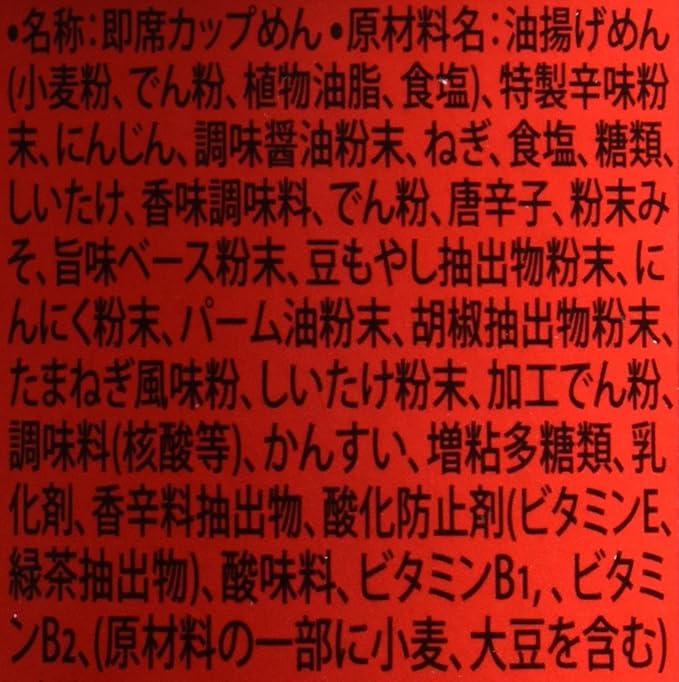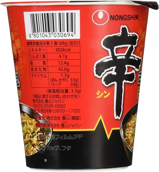 Ingredients: Fried noodles (wheat flour, starch, vegetable oil, salt, rice bran flavor liquid), carrots, salt, beef seasoning, seasoned soy sauce powder, spring onion, chili pepper seasoning powder, starch, shiitake mushrooms, sugar, umami base powder, chili pepper flakes, bean sprout extract powder, garlic extract powder, powdered miso, pepper powder, onion flavor powder, shiitake mushroom powder, ginger extract powder, modified starch, eggshell calcium, seasonings (nucleic acid etc.), kansui (alkaline water), thickening polysaccharides, spice extract, emulsifier, caramel color, acidulant, vitamin B1, antioxidant (green tea extract, vitamin E), vitamin B2, (some ingredients contain wheat, eggs, milk components, beef, soybeans, sesame) Product size (height x depth x width): 110mm x 100mm x 100mm A delicious Korean-style ramen with a harmonious blend of spiciness and richness. Brand Name: Spicy Manufacturer: Nongshim Japan