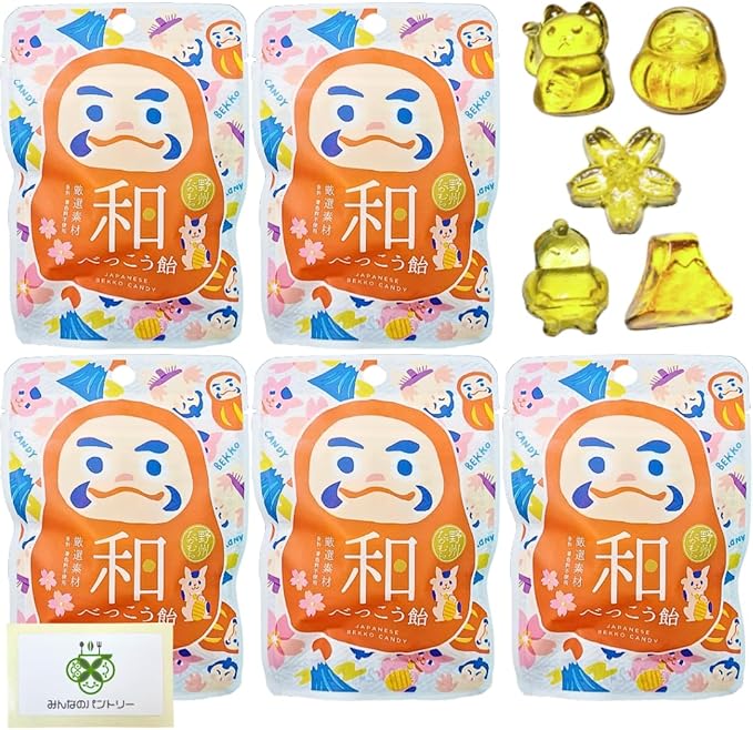 Contents: Set of 5 bags (each bag contains 5 bekko candy) Includes one candy each in the shapes of “Maneki Neko,” “Daruma,” “Sakura,” “Sumo,” and “Mt. Fuji.” These bekko candy are made with adorable Japanese motifs and are recommended as a Japanese souvenir for people overseas. Each bag is just the right size to fit in the palm of your hand. Perfect for small gifts or giving to others.