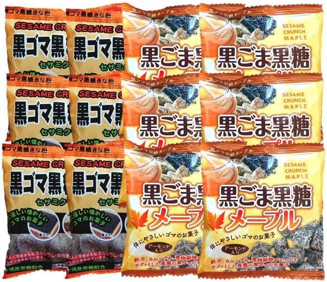 Crispy and delicious sesame snacks: Black sesame, brown sugar, and kinako (roasted soybean flour). Name: Sesame snacks. Net weight: 20g. Ingredients: Roasted black sesame (made in Japan), sugar (brown sugar, medium-sized coarse sugar), peanuts, starch syrup, kinako (soybean flour, contains soybeans), starch, salt. Black sesame, brown sugar, and maple sugar. Name: Sesame snacks. Net weight: 20g. Ingredients: Roasted black sesame (made in Japan), starch syrup, sugar (processed brown sugar, medium-sized coarse sugar), almonds, maple sugar, starch, salt, and flavoring.