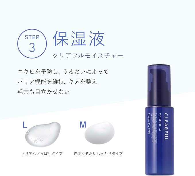 This two-week trial set includes the Clearful Series, a medicated skincare line that treats recurring acne and pores. It includes a cleanser, toner, and emulsion. Formulated with five Japanese and Chinese herbal ingredients and collagen, it soothes and prevents acne and rough skin. M Type (Moisturizing Type): For acne-prone, normal to dry skin. Quasi-drug. Contents: 20g cleanser, 40mL toner, 14g moisturizer.
