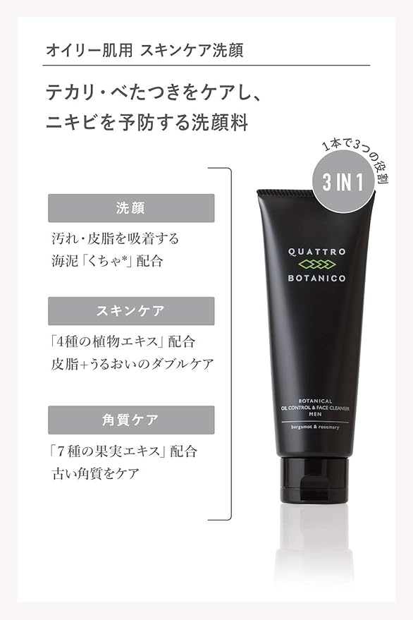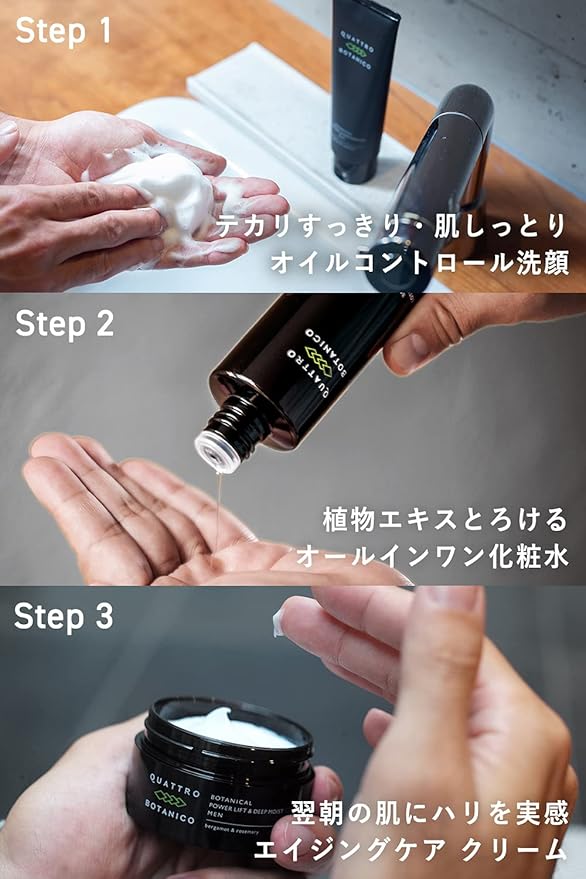 [Men’s 2-Week Cosmetics Set] This travel-sized set includes three essential skincare products: face wash, lotion, and cream, each lasting approximately two weeks. Perfect for first-time purchases or as a trial. Suitable for all skin types, including dry, combination, and oily skin. [Men’s Made in Japan Botanical Skincare] This men’s skincare set contains four botanical extracts that address the four major skin concerns faced by men: dryness, lack of firmness, sebum, and pore problems. The natural, refreshing scent of citrus bergamot blended with rosemary is a safe, Made in Japan product. [All-in-One Lotion] A single bottle provides the moisturizing sensation of both lotion and emulsion, yet blends smoothly into the skin without leaving a sticky feeling. The four botanical extracts deeply penetrate and address dryness, fine lines, and dullness. [Oil-Control Facial Cleanser] This skincare cleanser not only cleanses away sebum and pore impurities, but also balances the skin’s moisture and oil levels. [High-performance cream] This cream achieves both gravity-defying elasticity and moisturized skin without dryness. It’s non-sticky and leaves a refreshing feeling when used.