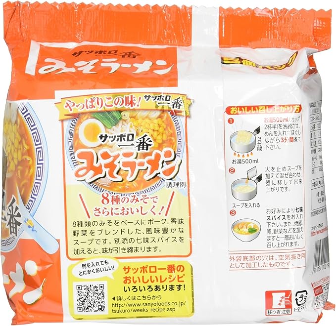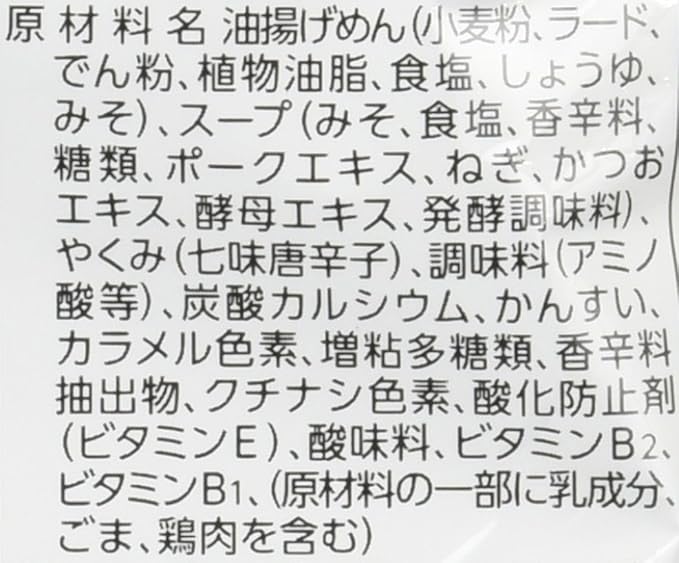 Ingredients: Fried noodles (wheat flour, lard, starch, vegetable oil, salt, soy sauce, miso), soup (miso, salt, spices, sugar, pork extract, green onion, bonito extract, yeast extract, fermented seasoning), seasoning (shichimi pepper), seasoning (amino acids, etc.), calcium carbonate, kansui (alkaline water), caramel color, thickener, spice extract, gardenia color, antioxidant (vitamin E), acidulant, vitamin B2, vitamin B1 (contains milk, sesame, and chicken). Product dimensions (H x D x W): 125mm x 160mm x 105mm. This pork-based soup is exquisitely blended with eight types of miso, each with its own distinctive flavor and aroma, and enhanced with aromatic herbs, creating a well-balanced flavor and richness that is one-of-a-kind. Brand: Sapporo Ichiban Manufacturer: Sanyo Foods