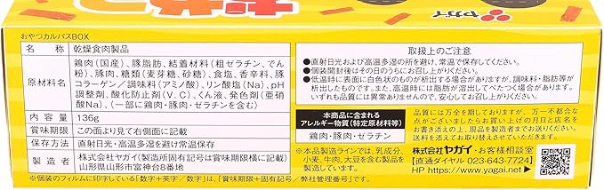 [Manufacturer Description] Yagai Co., Ltd. is a Yamagata-based company founded in 1974. Under the slogan “Deliciousness is Abundance,” we strive every day to deliver safe, reliable, and delicious products to our customers. [Product Features] Made primarily from chicken and pork, this product has a soft texture that even small children can enjoy. It features a cute panda character and a friendly package. Each piece is individually vacuum-packed for easy portability. Average weight per piece: 3.4g Average calories per piece: 15.8kcal Average protein per piece: 0.85g