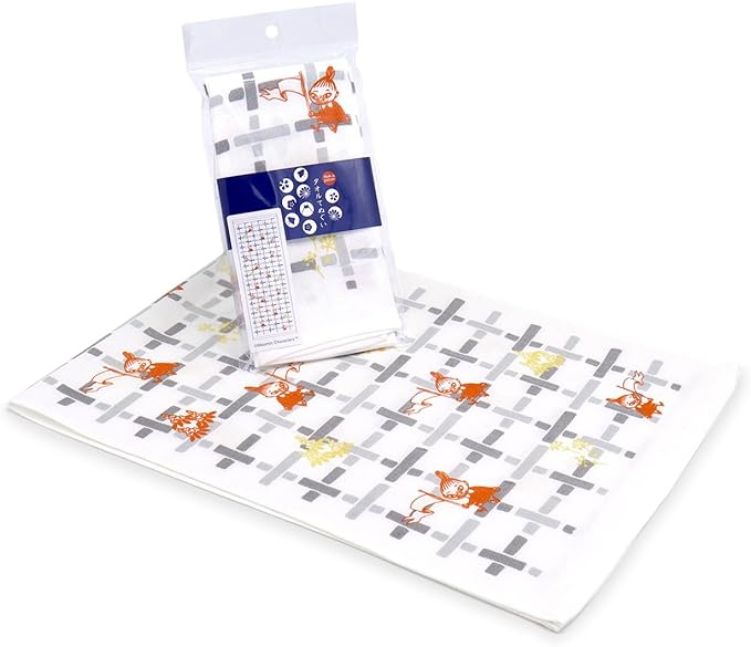 This Japanese-made tenugui towel is thin, easy to wring out, and quick to dry, making it perfect for use in the bath or sauna. Little My sits holding a flag in a cross pattern. The gray and orange coloring creates a charming design that harmonizes beautifully. It’s thin and light, so it’s easy to carry around. It folds up small, making it convenient for travel. The soft gauze pile fabric makes it easy to wrap around your neck as a sweatband, or use as a kitchen towel. This towel comes in a package, making it a great gift or souvenir.