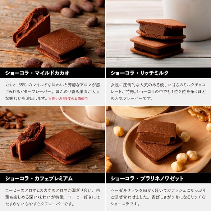 [Contents] 4 Chocolats (1 Mild Cocoa, 1 Rich Milk, 1 Cafe Premium, 1 Praline Noisette) [A masterpiece that sells 77 per second] Crisp, crunchy, and melty. Melty raw chocolate coated entirely in carefully selected couverture. Sandwiched between crispy butter cookies, this perennial bestseller will have you hooked once you try it. *March 5, 2024, 8:00 PM – 8:02 PM, 12,720 units sold [4 luxurious flavors] Mild Cocoa: A bitter flavor with a mild taste of 55% cocoa and a rich aftertaste. A subtle hint of liquor creates a sophisticated taste. / Rich Milk: A popular flavor. A gently sweet milk chocolate that is extremely popular with women. Cafe Premium: The rich aroma of coffee and the rich flavor of chocolate blend together to create a luxurious moment that spreads across your tongue. A deep flavor that lingers in your mouth. / Praline Noisette: A generous amount of crushed hazelnut paste is mixed into the ganache, creating a satisfying flavor that perfectly balances with the chocolate. [Featured on TV! Winner of the Japan Food Selection Grand Prix!] This product won the Grand Prix, the highest award, in a contest selected by 23,000 food analysts nationwide. Its refined chocolate aroma and balance with the cookies were highly praised. Enjoy the quality and flavor lauded by the Japan Food Selection judges. [Perfect Gift] Delivered in a luxurious box. Each piece is individually boxed, making it ideal for small gifts. Customers have praised the sturdy, individually packaged pieces for easy sharing. “Delivery Instructions” only apply when shipping via Amazon, so we cannot accommodate requests for delivery instructions in the “Special Delivery Instructions” section. *This product cannot be delivered to a designated location or delivered to a mailbox.